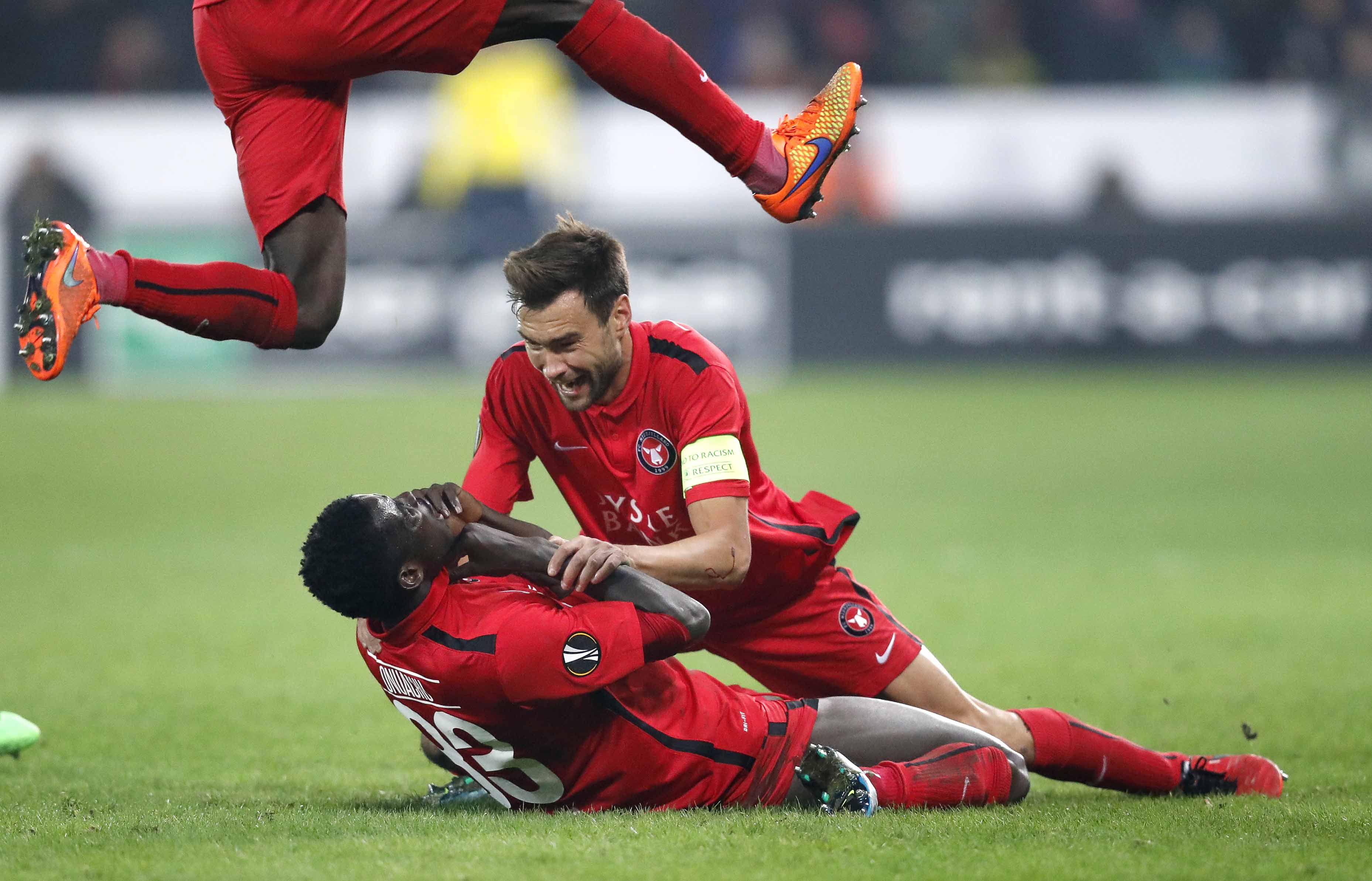 Champions League-playoff i Parken: FCK - Trabzonspor. FCKs Rasmus Falk og Trabzonspors Jens Stryger Larsen.